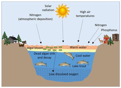 If nutrient concentrations are too high, excessive growth of algae can occur, leading to the layer of low dissolved oxygen taking up more of the lower levels of the lake. Solar radiation and arm air warm the surface of the lake, while the deeper waters stay cool throughout the summer. If solar radiation levels and air temperatures are too high, more of the surface waters of the lake may become too warm for lake trout.